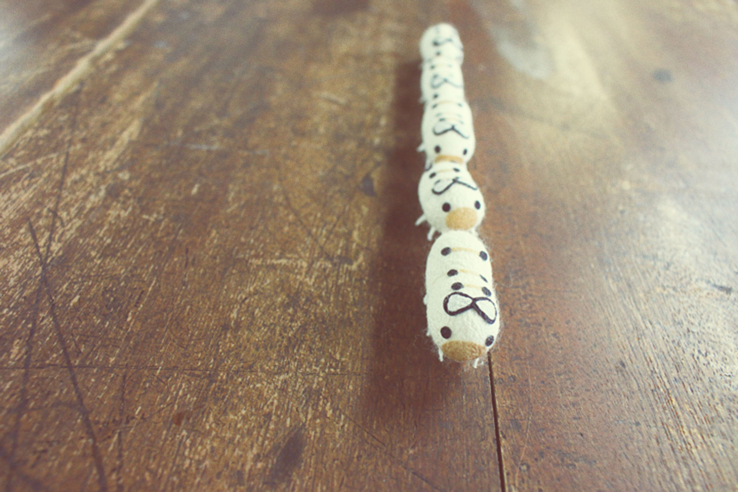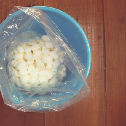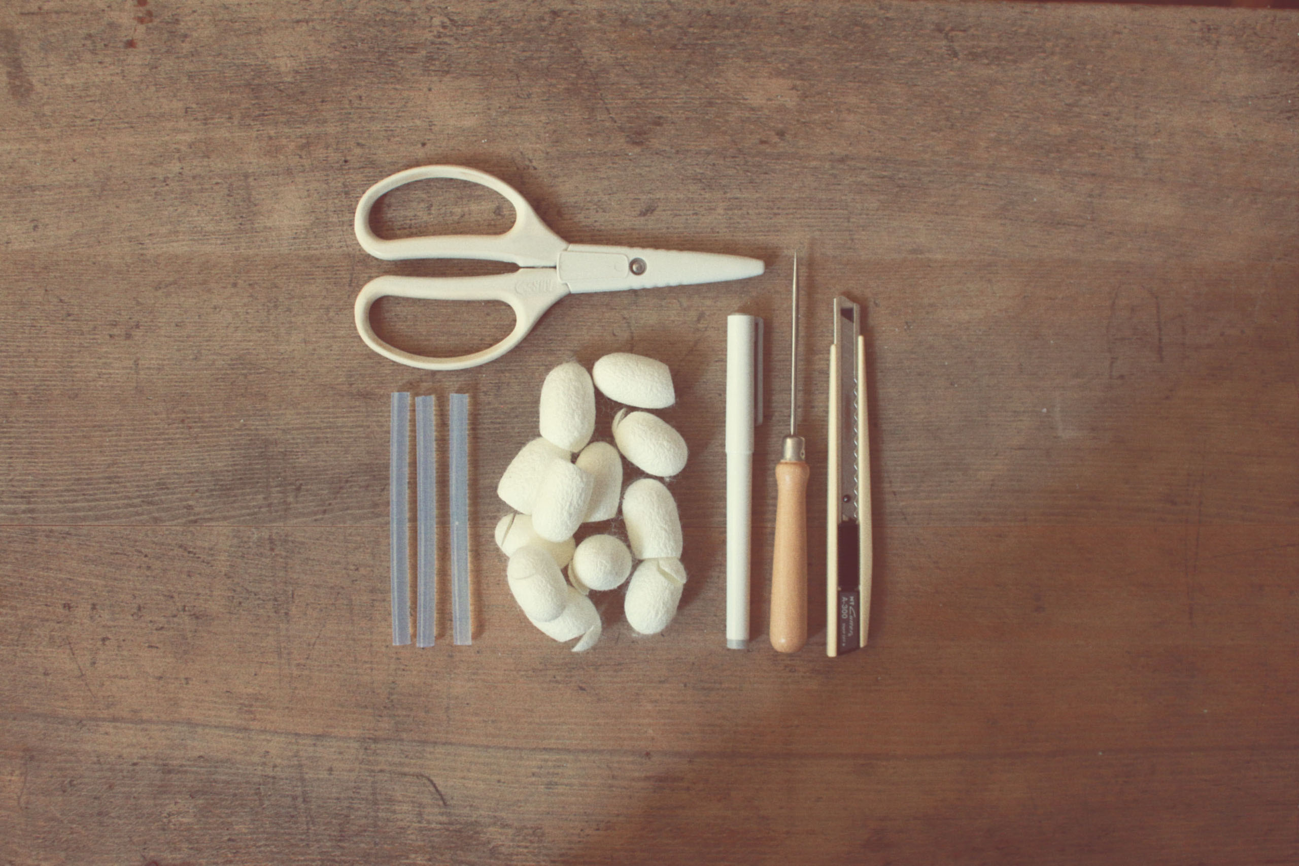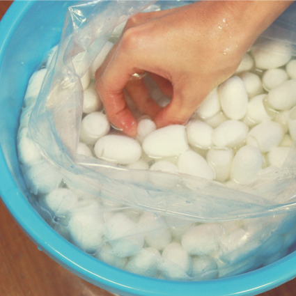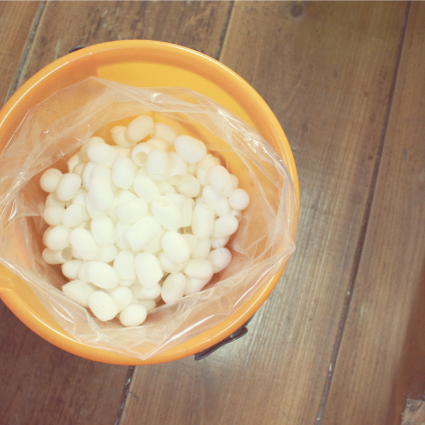 1 . ひとつひとつ丁寧に繭玉の中を掃除します。