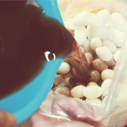9 . 混ぜ合わせた染料を繭に流し込みます。